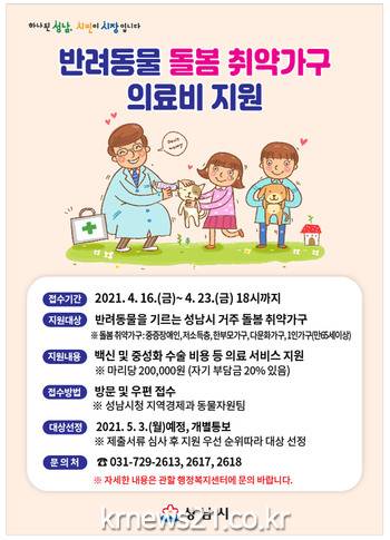 ▲ [사진=홍보포스터]성남시(시장 은수미)는 반려동물 돌봄 취약가구를 대상으로 의료비 지원 사업을 편다.
