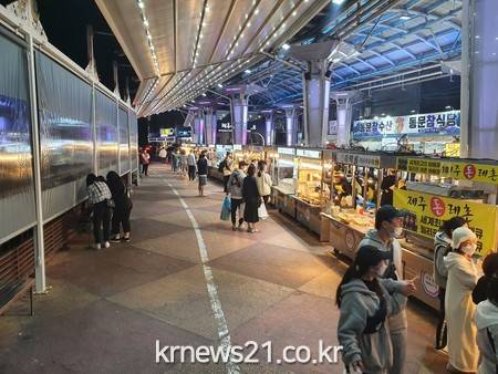 ▲ [사진제공 = 제주시]제주시에서는 새로운 매대 운영자 모집을 위해 임시 휴장하였던 동문재래시장 야시장을 지난 4월 12일부터 재개장했다고 밝혔다.