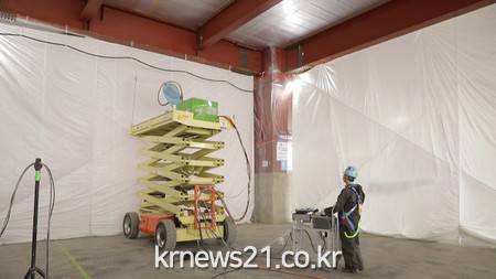내화뿜칠은 건물 철골 기둥과 보에 내화재를 덧칠해 높은 열에도 견딜 수 있게 하는 필수 작업이다. 이 작업은 근로자가 유독성 물질에 노출될 수 있는 데다 높은 곳에서 작업해야 하는 상황이 많아 고위험 작업으로 분류된다.