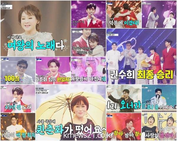 ‘퀸춘화 팀’과 ‘퀸수희 팀’이 결과를 알 수 없는 예측 불허 팽팽함을 이어가는 상황에서 마지막 라운드는 트롯 여왕 하춘화가 ‘허공’을, 김수희가 ‘비련’을 선곡해 역대급 대결을 벌였고 각각 98점대 100점을 받았다. 결국 ‘퀸수희 팀’이 최종 승리의 영광을 안았다.