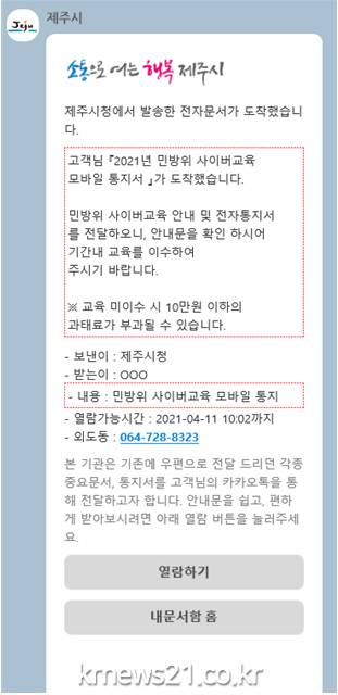 제주시는 도내 기관 최초로 우편으로만 발송되던 민방위 교육통지서와 차고지증명 안내문 3만여 건을 모바일로 발송했다고 밝혔다.