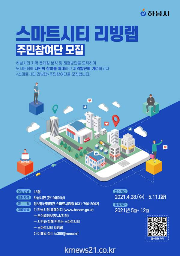하남시(시장 김상호)는 이달 28일부터 5월 11일까지 ‘스마트시티 리빙랩’시민참여단 15명을 모집한다고 밝혔다.