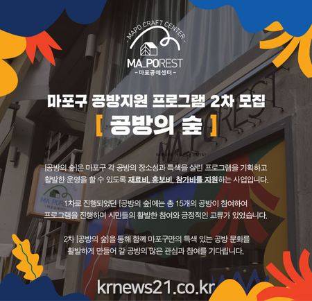 마포구(구청장 유동균)는 지역 내 공방을 대상으로 사업비를 지원해 신종 코로나바이러스 감염증(코로나19)으로 위축된 소비심리 회복 및 공방 활성화에 기여하는 ‘공방 프로그램 지원사업 [공방의숲]’의 참여자를 오는 9일까지 모집한다고 밝혔다.