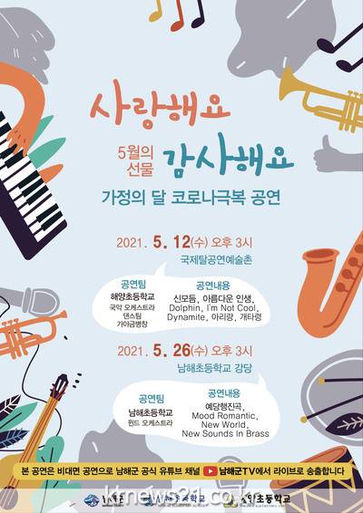 비대면으로 진행되는 이번 공연은 5월 12일(수) 오후 3시 해양초등학교의 국악 오케스트라, 댄스, 가야금 병창 공연에 이어 5월 26일(수) 오후 3시 남해초등학교 윈드 오케스트라 공연이 펼쳐진다.