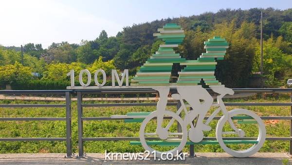또한, 자전거도로에는 거리를 나타내는 이정표가 감각적인 조형물로 설치되어 거리를 수시로