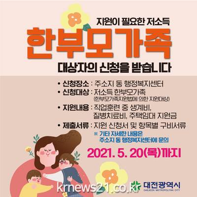 지원 요건을 충족하는 저소득한부모 가정은 오는 5월 20일까지 거주지 관할 행정복지센터로 방문하여 신청할 수 있고, 자세한 사항은 각 자치구 홈페이지나 동 행정복지센터에 문의하면 된다.