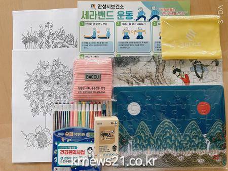 건강지킴이 꾸러미는 우울예방 및 신체활동을 위한 세라밴드와 운동 포스터, 인지 학습지 및 퍼즐, 영양제 등으로 구성하였으며, 희망엽서도 제공한다.