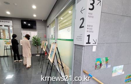 ▲ [사진제공 = 서대문구]서대문구 남가좌1동주민센터(모래내로15길 37) 내부 공간에 이러한 소감문과 함께 어르신들이 직접 그린 그림들이 전시돼 이곳을 방문한 주민들의 시선을 모으고 있다.