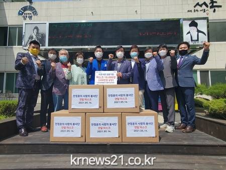 ▲ [사진제공 = 양평군]‘안정훈의 사랑의 봉사단’은 지난 14일 서종면사무소에 방문해 코로나19로 힘든 취약계층을 위한 덴탈 마스크 1만장을 전달했다.