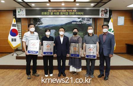 ▲ [사진제공 = 괴산군]충북 괴산군은 13일 친환경 쌀 사용 음식점을 추가로 지정해 현판을 수여했다고 밝혔다.