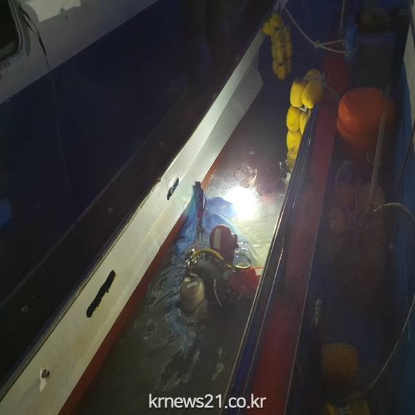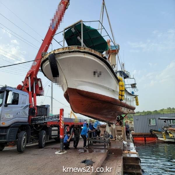 어선 A호는 돌산 군내항으로 예인완료 후 육상크레인 도착시 까지 여수구조대가 입수하여
