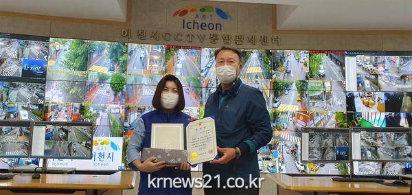 ▲ [사진제공 = 이천시]이천경찰서는 지난 28일 이천시 CCTV 통합관제센터의 저장영상을 활용하여 실종노인 찾는데 크게 기여한 관제요원 J씨에게 감사장을 수여 했다