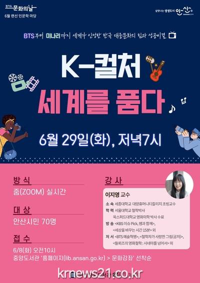 안산시(시장 윤화섭)는 이달 29일 오후 7시 이지영 세종대 교수의 ‘K-컬처, 세계를 품다’라는 주제의 강좌를 6월 랜선 인문학 마당으로 진행한다고 4일 밝혔다.