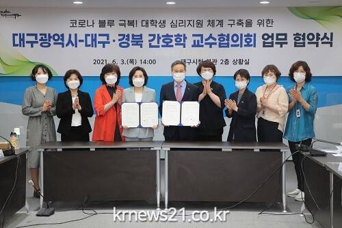 ▲ [사진제공 = 대구광역시]대구시는 6월 3일(목) 오후 2시 대구시청 2층 상황실에서 대구·경북 간호학 교수협의회와 함께 ‘대학생 코로나 블루 극복, 심리지원’을 위한 업무협약을 체결했다.