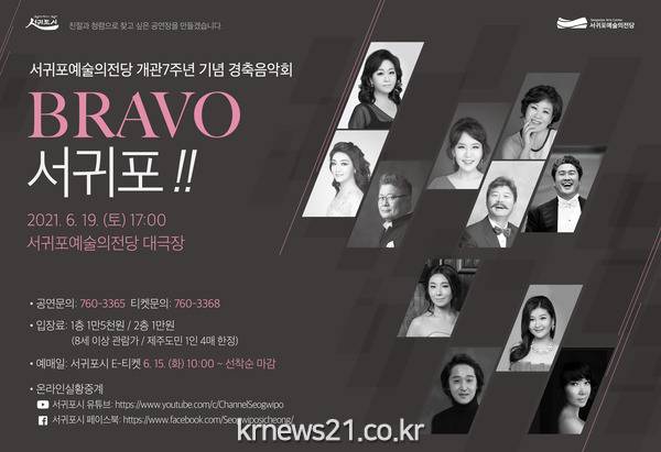 개관 7주년을 기념하여 개최되는 「BRAVO 서귀포!!」 공연에는 대중에게 큰 사랑을 받는 세계적인 성악가 바리톤 김동규, 소프라노 박미자, 소프라노 신지화, 테너 이정원 등 국내 최정상 성악가 10여명 출연한다.