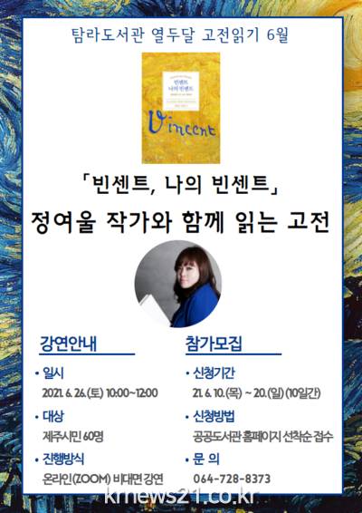 ▲ [사진=홍보포스터]탐라도서관(관장 고영범)은 6월 26일 오전 10시, 열두달 고전읽기 독서 캠페인으로 ‘정여울 작가와 함께 읽는 고전’「빈센트 나의 빈센트」온라인 강연을 진행한다.