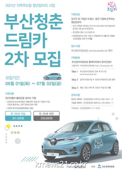 부산시(시장 박형준)는 대중교통 취약지역인 강서구·기장군 소재 중소·중견기업에 신규 취업한 청년에게 전기차 임차료를 지원하는 「2021년 부산청춘드림카 사업」의 2차 참여자 35명을 7월 2일까지 모집한다고 밝혔다.