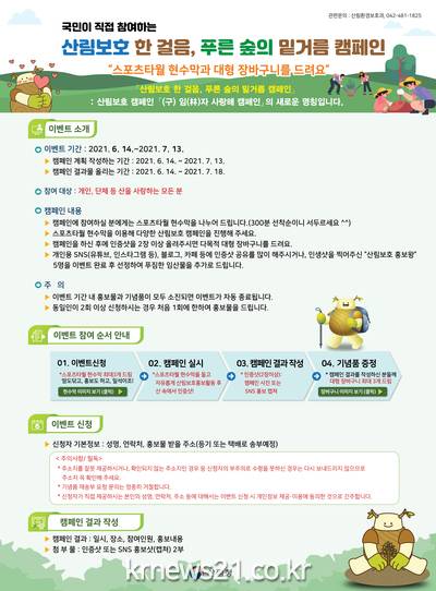 ▲ [사진=홍보포스터]산림청(청장 최병암)은 6월 14일부터 7월 13일까지 한 달간 산림보호에 대한 자발적 참여를 확산하고 숲사랑 문화를 정착하기 위해, ‘산림보호 한 걸음, 푸른 숲의 밑거름’ 온라인 운동(캠페인)을 실시한다.