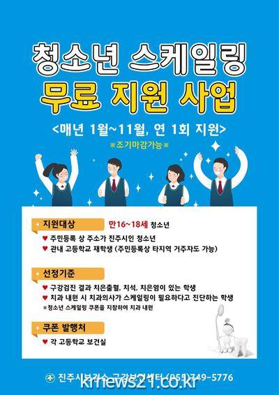 ▲ [사진=홍보포스터]진주시 보건소는 치주 질환 조기발견 및 예방을 통해 성인기의 건강한 구강 환경 기틀을 마련하고자 치주 질환이 있는 관내 청소년을 대상으로 스케일링 진료비 지원 사업을 무료로 시행하고 있다.