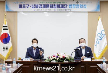 마포구(구청장 유동균)는 지난 18일 마포구청에서 (사)남북경제문화협력재단(이사장 임종석, 이하 ‘경문협’)과 ‘새롭고, 지속적인 남북협력을 위한 업무협약’을 체결했다고 밝혔다.