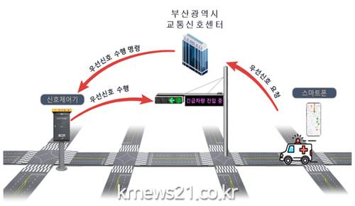 ▲ [이미지제공 = 부산시]부산시(시장 박형준)는 부산대학교병원 권역외상센터 일원을 대상으로 응급환자의 골든타임 확보를 위한 ‘긴급차량 우선신호시스템’을 6월 말부터 시범 운영한다고 밝혔다.