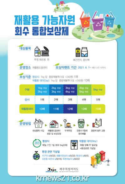 서귀포시 관계자는 “재활용 가능자원 회수 통합보상 이벤트가 재활용 자원 분리배출 활동이 몸에 밸 수 있는 촉매제가 되길 바라며, 매달 개최되는 재활용데이 행사에 시민들의 적극적인 참여를 바란다”고 말했다.