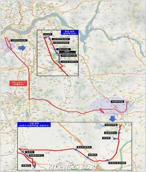이천터미널~강남역 신규노선의 운행경로는 상행 이천터미널에서 출발하여 상공회의소, 이천역, 유산리․ 유산상회, 안평2리, 표교초등학교, 오천리, 마장면사무소, 덕평1리, KCC사옥, 신논현역․ 주류성빌딩, 신분당선 강남역(중)까지 운행하며,