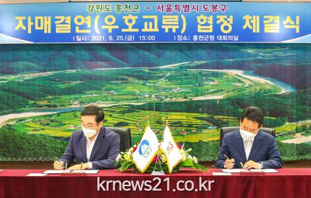 ▲ [사진제공 = 도봉구]서울시 도봉구(구청장 이동진)는 강원도 홍천군(군수 허필홍)과 지난 6월 25일 우호교류 협정을 체결하고 두 도시의 공동번영과 주민복지 향상을 위해 협력하기로 했다.
