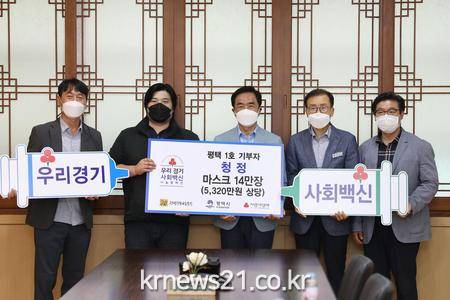 ▲ [사진제공 = 평택시]경기사회복지공동모금회(회장 이순선, 이하 경기사랑의열매)가 지난 6월 15일부터 오는 7월 31일까지 47일 동안 코로나19로 어려움을 겪는 재난취약계층을 돕기 위해 진행하고 있는 ‘우리 경기 사회백신’ 나눔캠페인 평택지역 1호 기부자가 탄생했다고 밝혔다.
