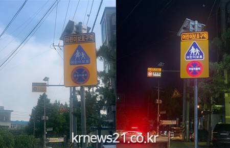 발광형 표지판은 태양전지를 활용하여 자체적으로 빛을 밝혀 야간 및 우천 시에도 어린이보호구역임을 명확히 식별할 수 있는 장점이 있다.