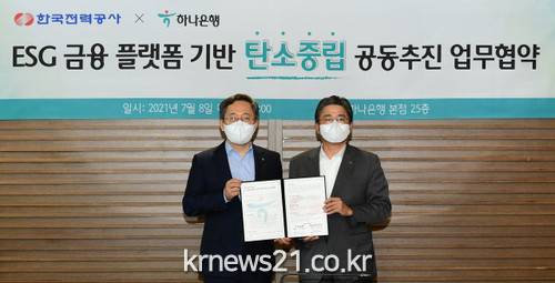 이번에는 금융기관인 하나은행(은행장 박성호)과 8일 서울 중구 하나은행 본점에서 정승일 한전 사장과 박성호 하나은행장이 참석한 가운데 ‘금융플랫폼 기반 탄소중립 공동추진’을 위한 업무협약을 체결했다. 한전과 하나은행 간 이번 업무협약은 금융플랫폼을 활용한 에너지기업·금융기관 간 저탄소 사회 전환 최초 협업사례로, 협약을 통해 전기사용량 데이터와 결합한 금융 상품을 고객에게 제공해 합리적인 전기 사용을 유도할 계획이다.