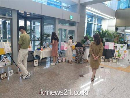 ▲ [사진제공 = 이천시]이천시(시장 엄태준)는 지적/자폐성장애인을 대상으로 한 「미술심리치료프로그램」에 참여한 교육생의 작품을 이천시청 1층 민원실 로비에서 7월 8일부터 14일 간 전시한다고 밝혔다.