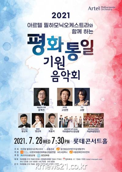 아르텔 필하모닉오케스트라와 함께하는 평화통일 기원음악회가 28일(수) 오후 7시 30분 롯데콘서트홀에서 개최된다. 공연 시간은 최근 코로나19 수도권 4단계 격상으로 기존 오후 8시에서 오후 7시 30분으로 변경됐다.