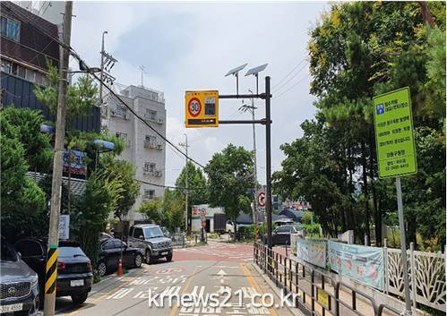 ▲ [사진제공 = 강동구]강동구(구청장 이정훈)는 어린이보호구역 내 어린이들의 안전한 보행 환경 조성을 위해 고덕초, 선사초 2개소에 차량의 주행속도 감속을 유도하는 태양광 과속경보시스템을 설치했다고 밝혔다.