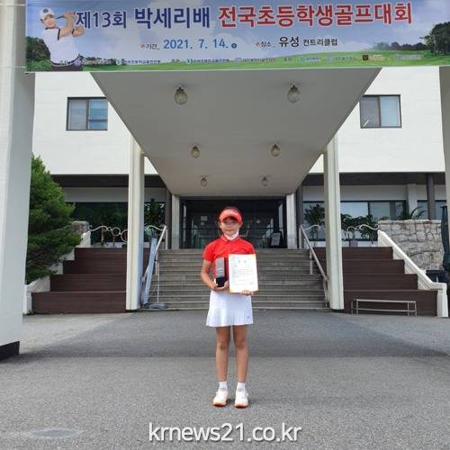 ▲ [사진제공 = 진주시](사)진주스포츠클럽(회장 김양수)은 지난 14일 대전 유성CC에서 개최된 2021년 박세리 배 초등부 골프대회에서 진주스포츠클럽 소속 선수 박효담(초전초 4)이 참가해 연장전에서 박빙의 우승을 거뒀다고 밝혔다.