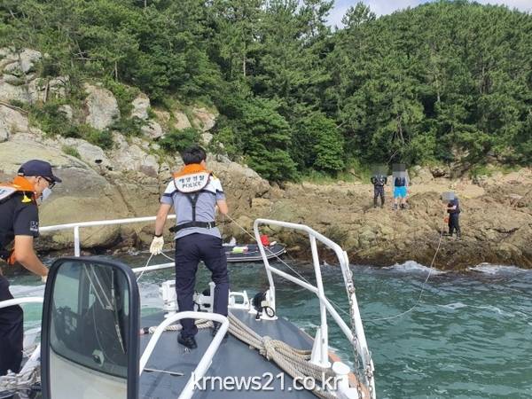 모두 갯바위에 올라가 있어 안전상태 이상 없으며, 모터보트는 갯바위에 좌초된 상태 확인 후
