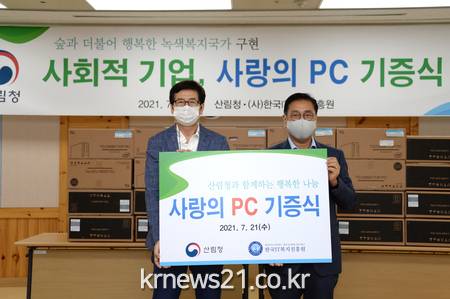 산림청(청장 최병암)은 21일 정부대전청사에서 컴퓨터를 비롯, 총 273점의 전산기기를 사회적기업인 (사)한국아이티(IT)복지진흥원에 무상으로 전달하는 ‘사랑의 컴퓨터 기증행사’를 가졌다.