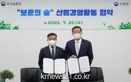 산림청(청장 최병암)은 7월 21일 국가보훈처(처장 황기철)와 ‘보훈의 숲 산림경영활동 상호 협력’을 위한 업무협약을 국립대전현충원에서 체결했다.