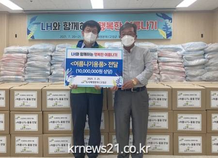 ▲ [사진제공 = 고성군]LH 도시재생본부(본부장 김백용) 임직원은 7월 20일과 21일, 양일간 고성군 관내 취약계층의 시원한 여름나기를 돕고자 여름나기 물품을 준비하고 직접 비대면으로 전달하는 나눔 활동을 펼쳤다.