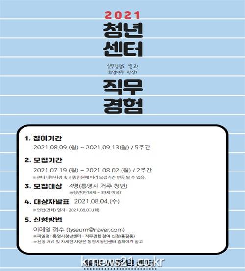 지난 7월 19일부터 제3차 직무경험 프로그램 참가자를 모집하고 있으니 참가를 희망하는 통영 내 거주하고 있는 청년(만18세~39세 이하)은 통영시청년센터 홈페이지(www.tyseum.or.kr)를 참고하여 신청하면 된다.