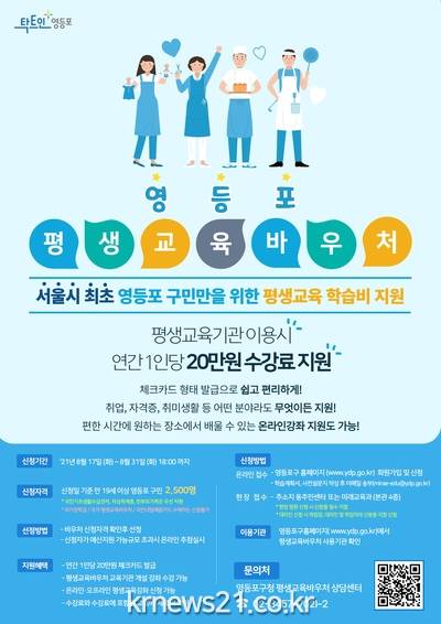 영등포구(구청장 채현일)가 올해 9월부터 서울시 자치구 최초로 만 19세 이상의 구민들에게 평생교육 학습이 가능한 20만 원 상당의 바우처(카드)를 지급한다고 밝혔다.