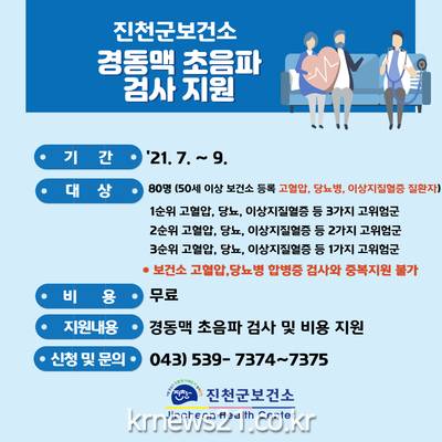 ▲ [사진=홍보포스터]진천군은 오는 9월까지 군에 등록된 고혈압, 당뇨병, 이상지질혈증 질환자 80명를 대상으로 경동맥 초음파 검사를 지원한다고 29일 밝혔다.