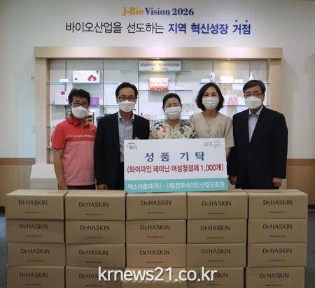 ▲ [사진제공 = 진주시]맥스아로마(주)(대표 하재순)는 4일 오후 2시 바이오산업진흥원에서 열린 기탁식에서 더위에 취약한 저소득층에 전달해 달라며‘와이파인 페미닌 청결제’1,000점(환가액 2800만원)을 진주시복지재단(이사장 이성갑)에 기탁했다.