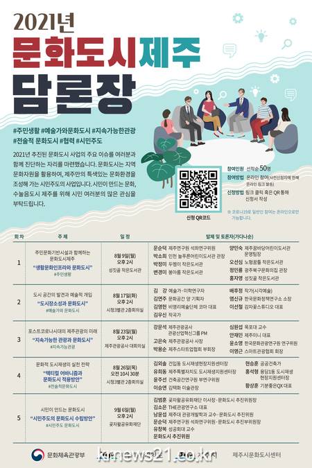 <문화도시 담론장>은 주민문화기반시설과 함께하는 문화도시, 도시장소의 발견과 예술적 개입, 포스트코로나 시대의 제주관광의 미래, 문화적 도시재생의 실천전략, 시민이 만드는 문화도시 등 총 5개 주제를 심도 있게 다룬다.