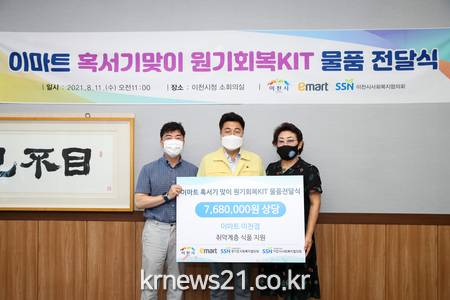 ▲ [사진제공 = 이천시]이천시사회복지협의회(회장 최종록)는 이마트 이천점(점장 이근수), 이천시청(시장 엄태준)과 함께 “이마트 혹서기 맞이 원기회복KIT 지원사업” 물품 전달식을 11일 에 이천시청에서 진행했다.