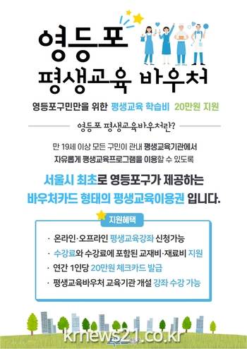 ▲ [사진=홍보포스터]영등포구(구청장 채현일)가 서울시 자치구 최초로 시행하는 「영등포 평생교육바우처」사업에 참여할 신청자를 8월 17일부터 31일까지 모집한다고 밝혔다.