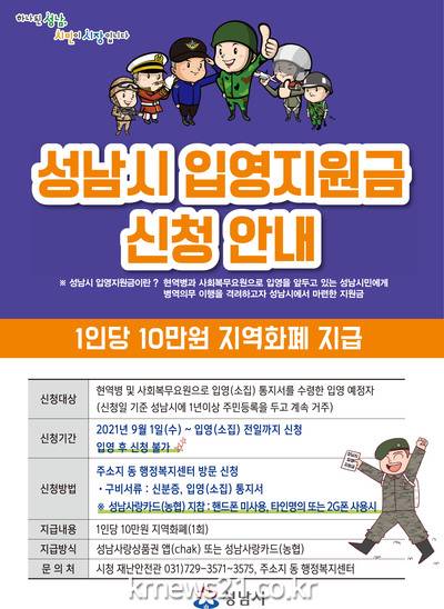 시는 접수일부터 8일 이내에 모바일 성남사랑상품권 앱 ‘착(chak)’ 또는 성남사랑카드로 입영지원금을 지급한다.