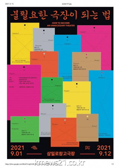 ▲ [사진=홍보포스터]서울문화재단(대표이사 직무대행 주용태) 삼일로창고극장이 코로나 시대에 극장의 역할을 모색하는 기획 프로그램 ‘불필요한 극장이 되는 법’을 9월 1일(수)~12일(일)까지 2주간 진행한다.