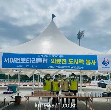 ▲ [사진제공 = 이천시]서이천 로타리클럽(회장 정의석, 회원48명)은 17일 부발읍 소재 코로나19 예방접종센터를 방문하여 코로나19 예방접종 추진에 전력을 기울이고 있는 의료진 및 종사자들을 격려하기 위해 자활센터에서 준비한 점심 도시락 100개와 시니어클럽에서 준비한 커피와 음료를 제공하였다.