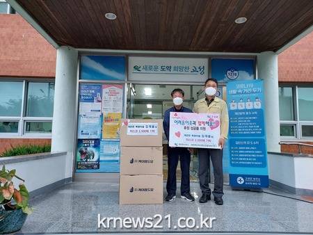 ▲ [사진제공 = 고성군]개천면(면장 이연옥) 북평마을 김재을 씨는 8월 24일 코로나19로 인해 경로당 이용에 어려움을 겪고 있는 어르신들께 전달해 달라며 마스크 2,500매(100만원 상당)를 개천면에 기탁했다.
